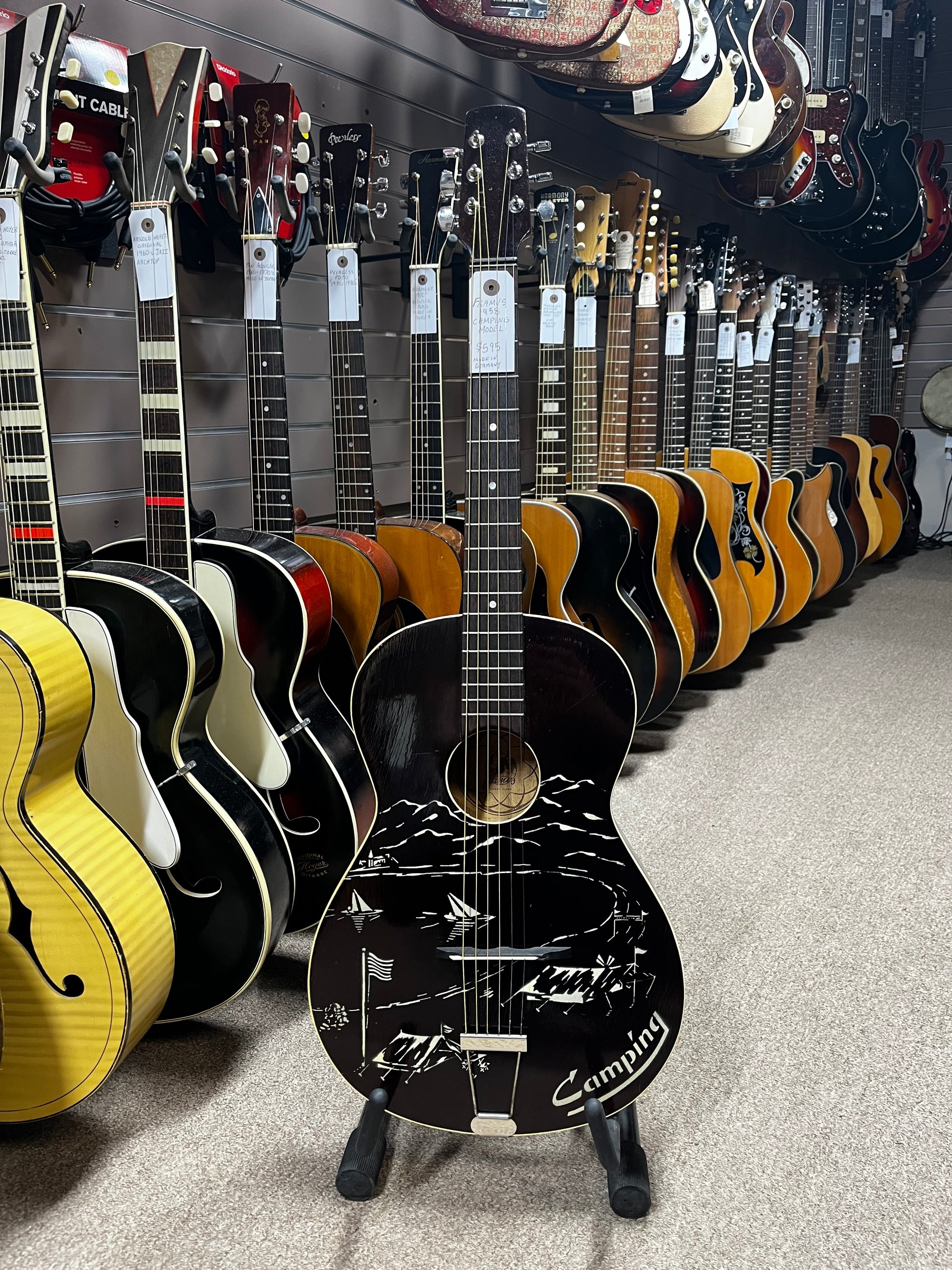 - The guitar in the image features a black finish with a white "Camping" graphic depicting a camping scene with tents and boats.