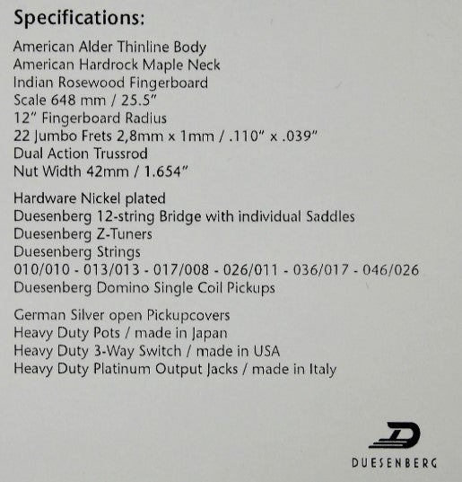The Duesenberg Caribou 12-string is a chambered, solidbody electric guitar with a unique "Cat Eye" F-hole, featuring a one-piece Maple neck, solid Alder body, and a dual-pickup configuration of Duesenberg Domino P90s. It incorporates Duesenberg's "Diamond Deluxe" tremolo system, a Plek'd fretboard for superior playability, and distinctive cream binding around the body and neck. The chambered construction and dual P90s provide a classic, jangly tone ideal for the 12-string format, offering versatile sounds from mellow to aggressive.