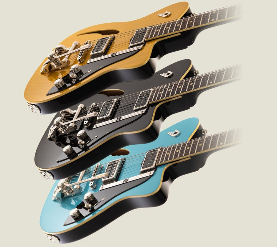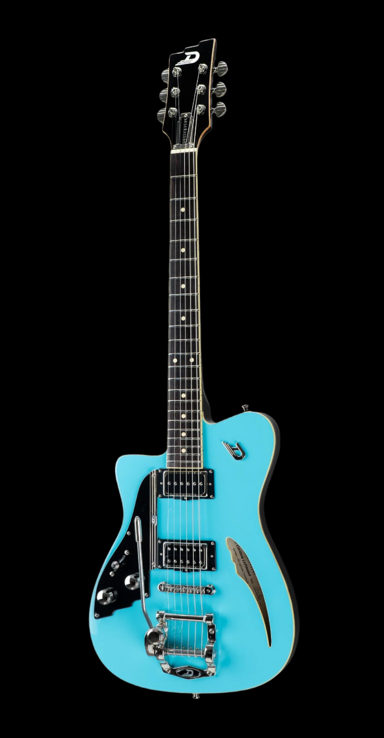 The body is fitted with a flat Maple top for the Narvik Blue model. All models feature a classy cream binding around the body and one-piece Maple neck, a Duesenberg Cat-Eye F-Hole, and an award winning set of pickups.