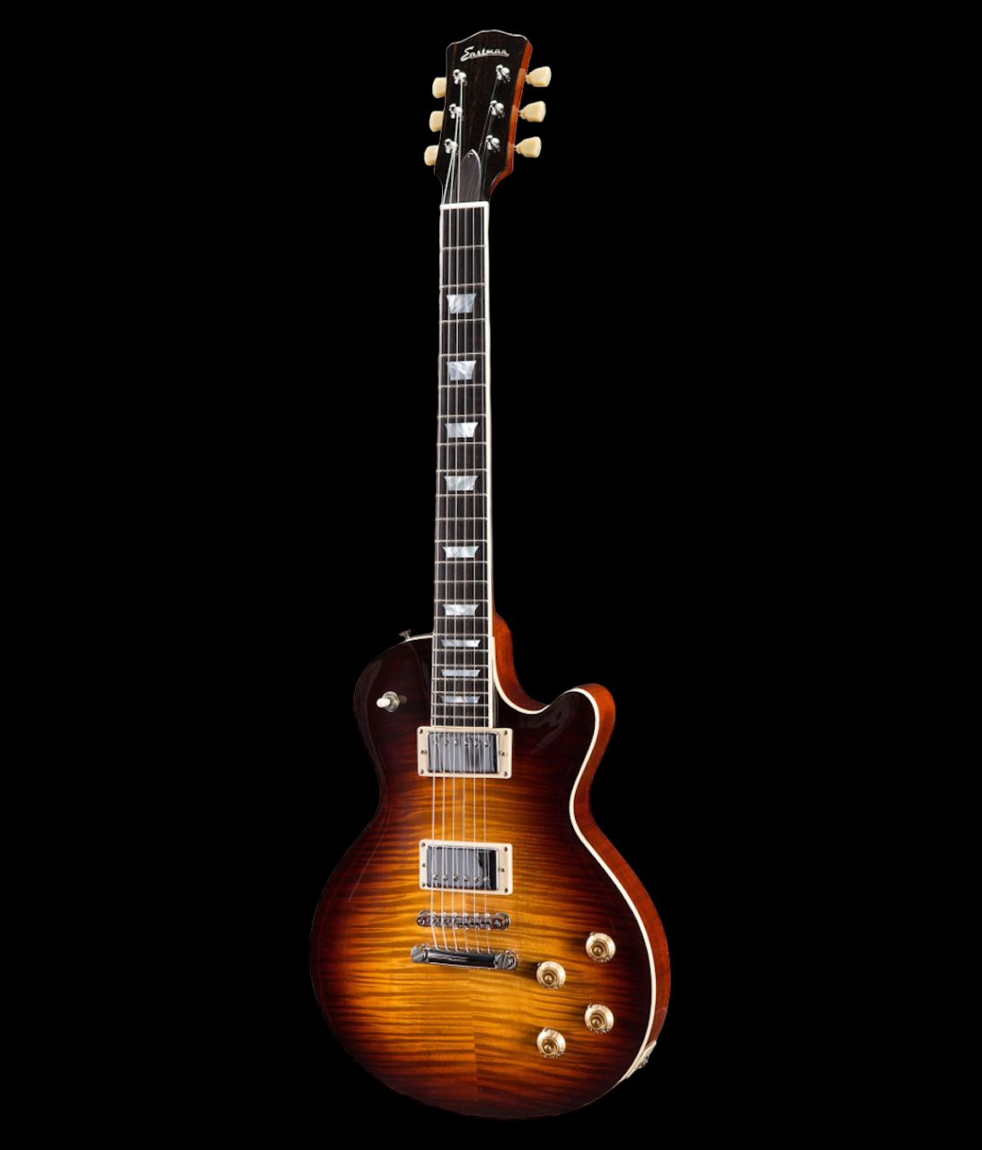 The Eastman SB59-SB is a single-cutaway solid-body electric guitar inspired by the Les Paul design, featuring a single-piece Mahogany body, a solid carved Flame Maple top, a Mahogany neck with an Ebony fingerboard, and Seymour Duncan '59 humbucker pickups. It boasts premium features like a sunburst gloss finish, bone nut, pearl crown inlays, ivoroid binding, and Gotoh/Faber hardware, providing a comfortable playing feel and a versatile, vintage-inspired sound.