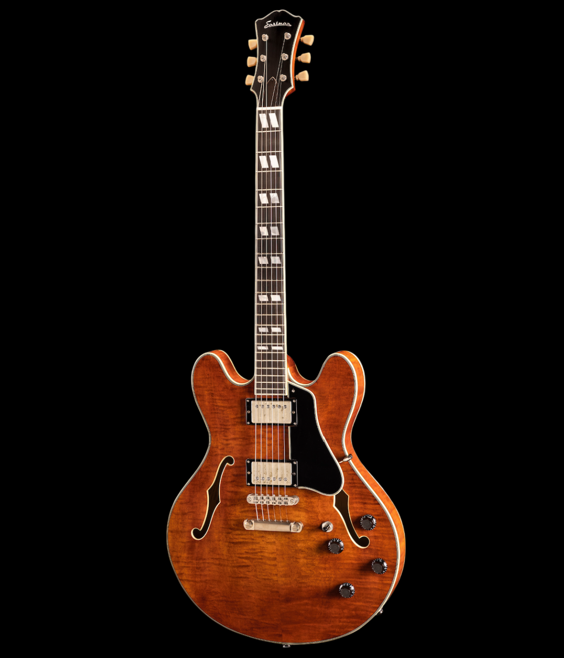 The Eastman T59/TV-AMB is a 16-inch, semi-hollow Thinline electric guitar designed to be a versatile instrument with a classic look and feel. It features a deluxe Flamed Maple laminate body, a three-piece Maple neck with an Ebony fingerboard, and is finished in a hand-rubbed Antique Amber Truetone Vintage finish. The guitar is equipped with two Seymour Duncan Antiquity humbucker pickups for a dynamic, vintage-style tone, along with premium Gotoh relic hardware and Switchcraft/CTS electronics.