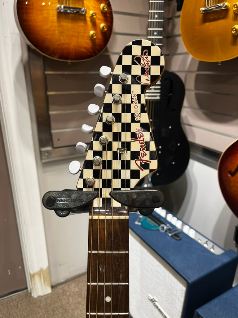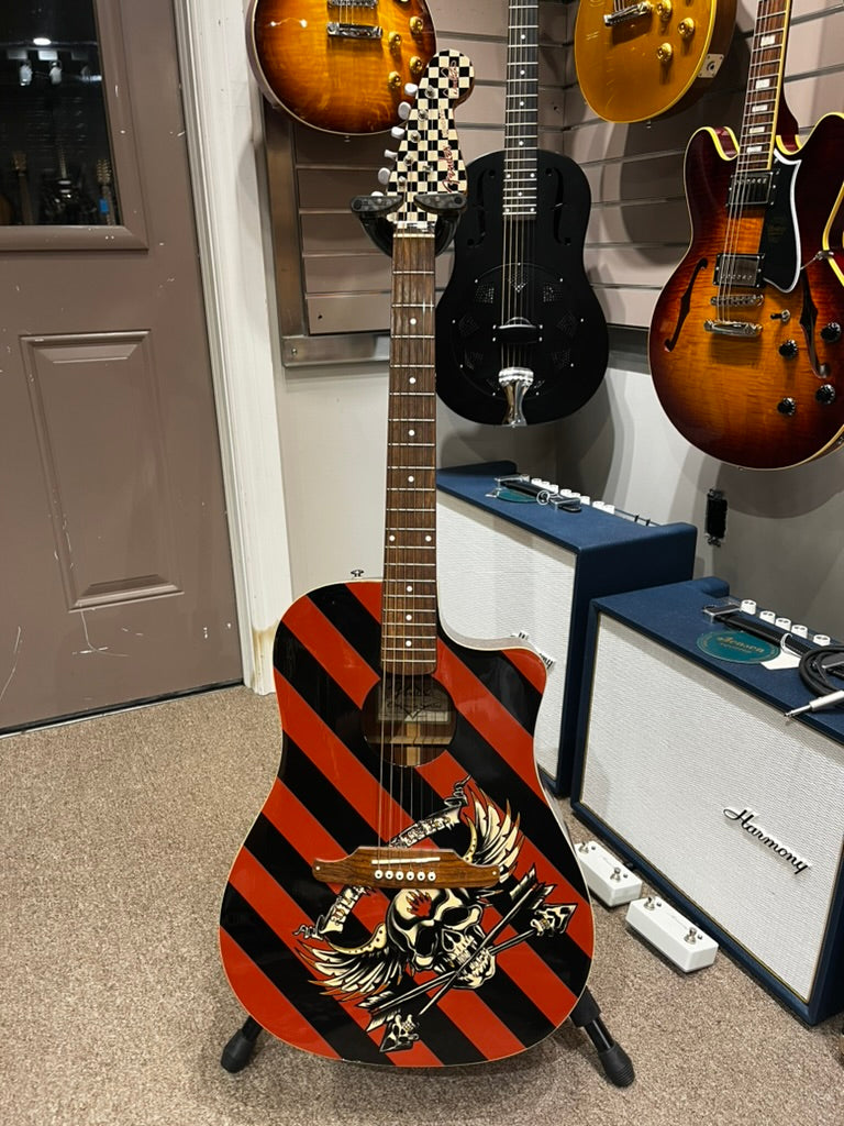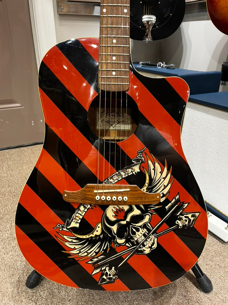 Fender have, in collaboration with Duane "Master of Disaster" Peters, lead singer of infamous Orange County punk outfit U.S. Bombs and Legendary old-school skateboard master have developed the decidedly distinctive design of this exclusive limited edition Fender Sonoran SCE model (only 500 instruments worldwide, period). It has a custom graphic finish with skulls and red and black stripes-pure Duane Peters, in other words.