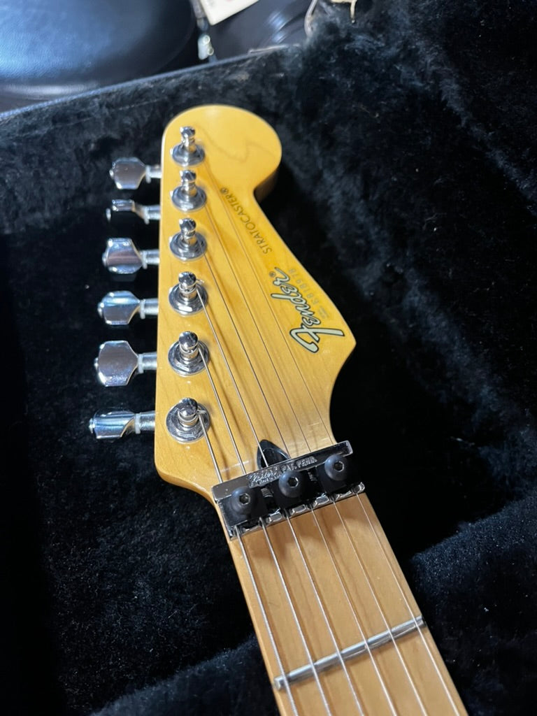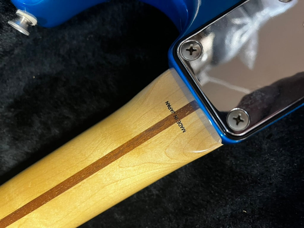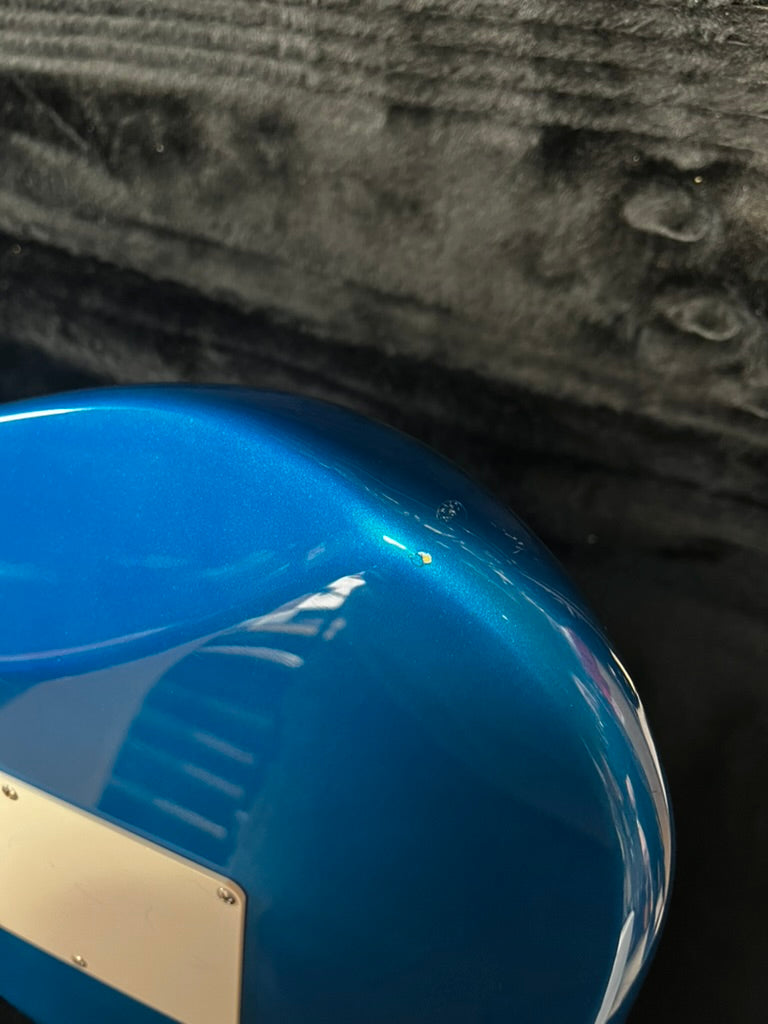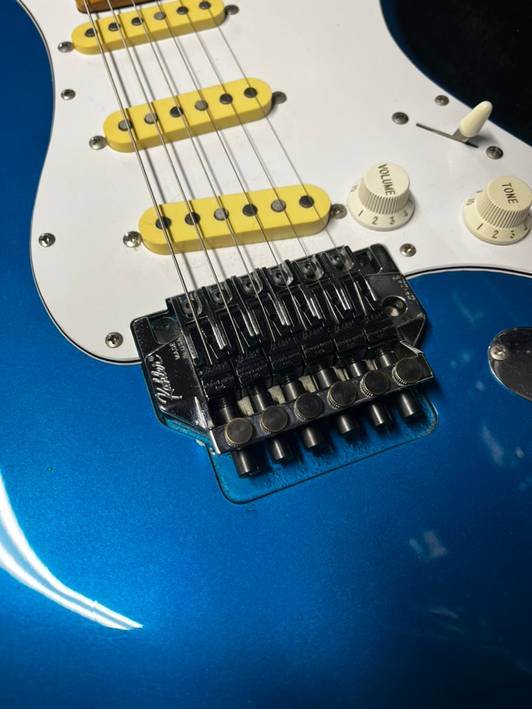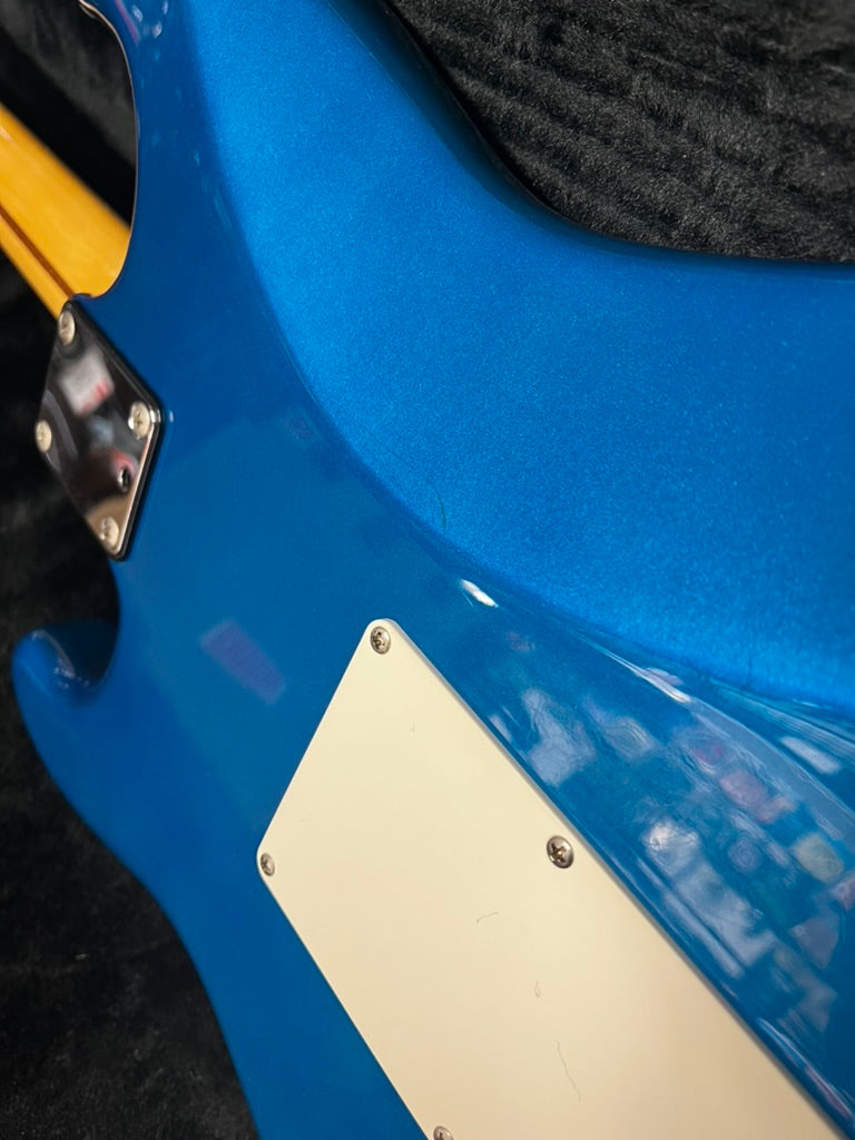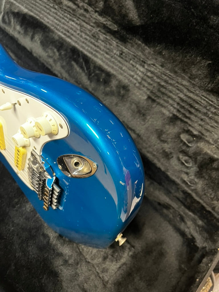 While Fender was moving factories in the early 1980s, they began producing guitars in a Japanese facility and one year all Fender guitars were produced in Japan. Since they have all but discontinued Japanese production, these guitars have created their own fan base with interesting components and custom colors. This is a great example with Kahler 2-point tremolo (the locking nut has been removed and is in the case minus the tightening screws and the actual tremolo arm is replaced with a non-original that functions but does not snap into place), a unique color (is it California blue? it does have a metallic twang to it), and all the mojo from these Eighties Strats. Plays and sound great with moderate to heavy playwear. Comes w/HSC.