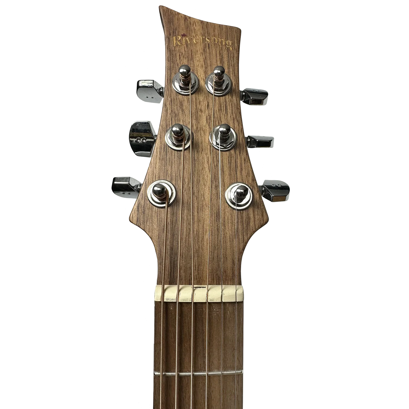 Riversong's unique patented Adjustable Neck-thru System™ also has a truss rod that runs the full length of the neck. Most traditional guitars have a truss rod that ends at the 14th fret with an elongated screw head. Riversong necks have a full-length truss rod that adjusts the entire length. This is closer to how an electric guitar is constructed.