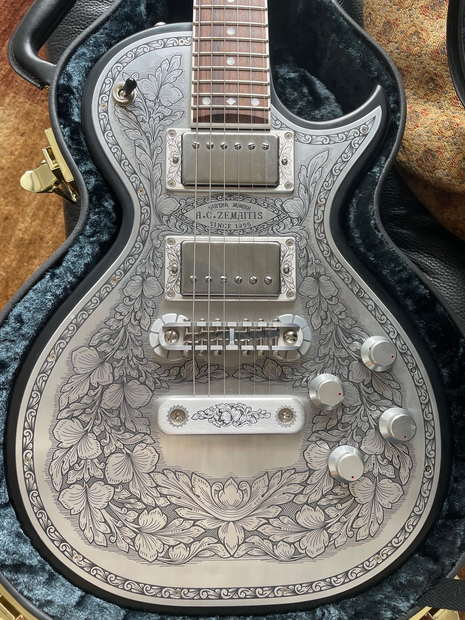 Here’s a stunningly beautiful, mint condition, 2012 Zemaitis featuring the classic original floral aluminum etched /engraved top first designed by the company’s master artist Danny O’Brien.